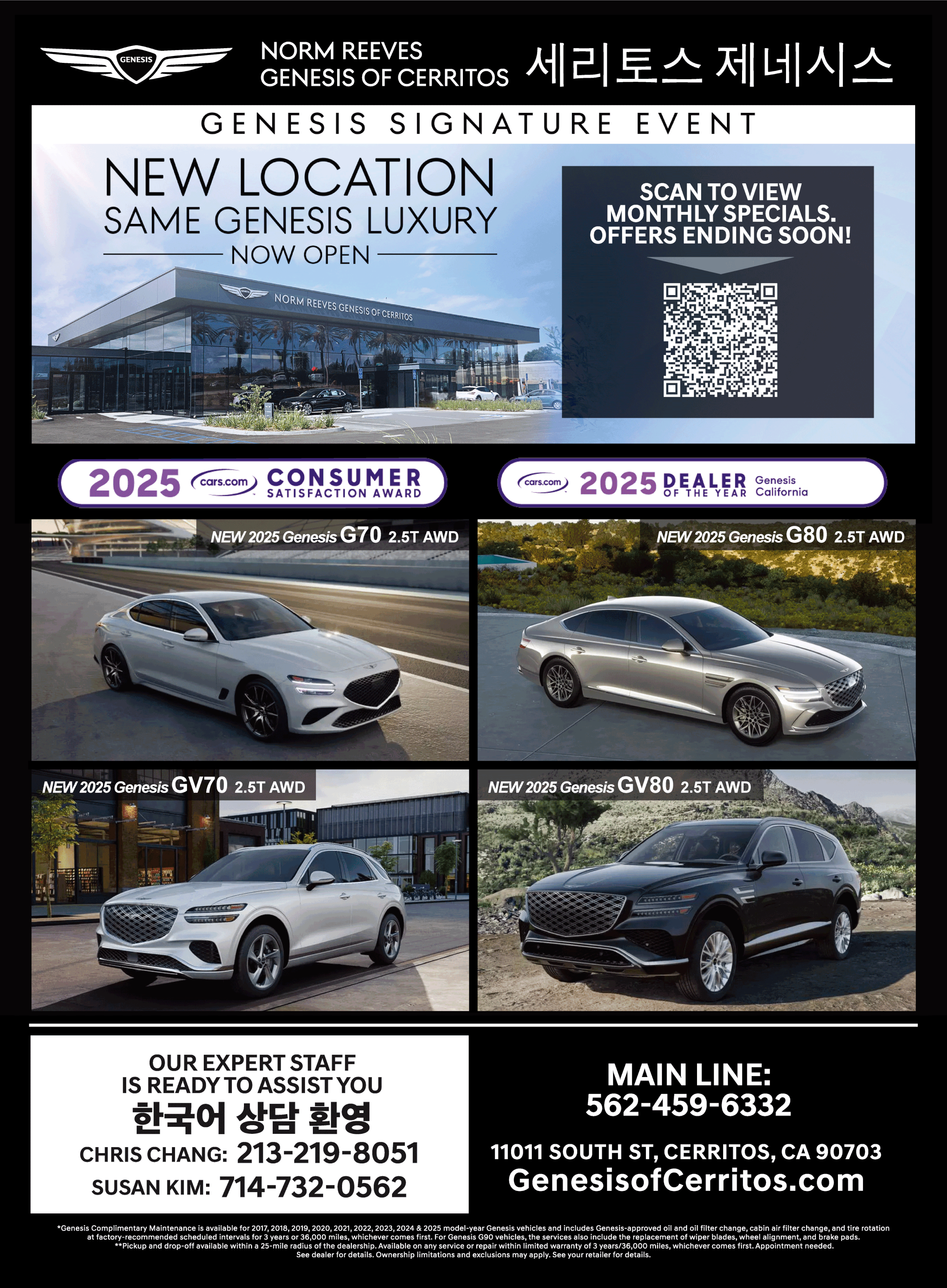 Launch ad for the new Norm Reeves Genesis of Cerritos location. The layout opens with a clear promise of the move and consistent Genesis luxury, then directs readers to monthly specials through a large QR panel. Award badges add proof, a four model grid enables fast comparison of the models, and a bilingual service cue with named advisors supports Korean American shoppers.